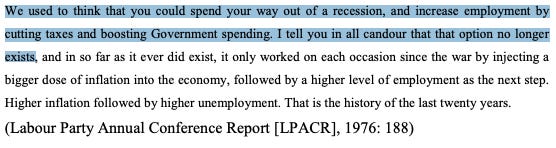 By the time James Callaghan took over from Wilson as Labour leader and PM in ‘76, the consecutive years of domestic inflation caught up with the pound’s nominal exchange value, depreciating 20% by September. In lay terms: other nations viewed the domestic British economy to be fucked, and so our currency was correspondingly fucked. Healey pleaded with the Washington-based International Monetary Fund (IMF) for a bailout, and $3.9billion came later that year, with strings attached. (Something of a precursor to the IMF’s ‘structural adjustment programmes’.) The IMF demanded that the UK cut its public spending by a further $7billion from 1977-79; Healey negotiated $2.5billion of cuts over the period. Callaghan made the following speech to Labour Conference on 28/09/76, just after Healey had announced the IMF loan, though, as Bogdanor observes, the speech ‘did no more than confirming for public consumption a policy shift that had already been made’: