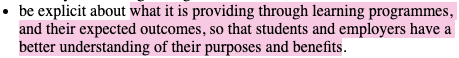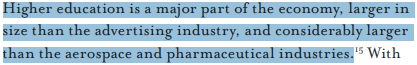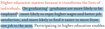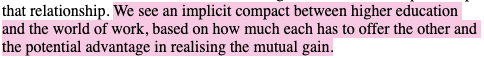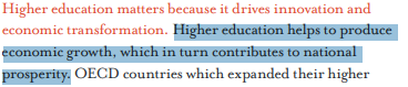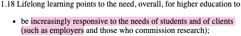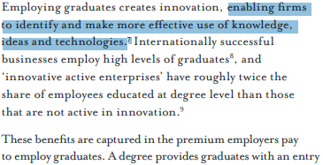 Within this by now familiar schema, the report clarifies what it sees as the point of a university education, and where a degree’s ‘value’ lies. A description is provided of ‘the central role of higher education in the economy’: