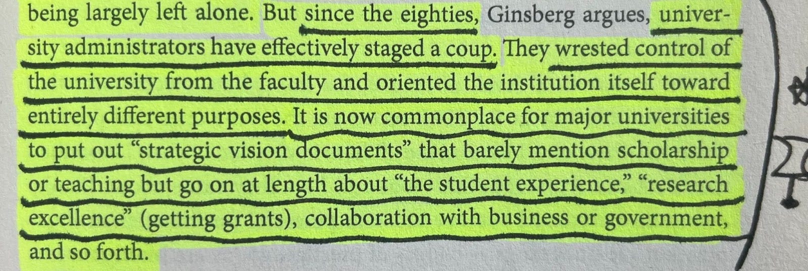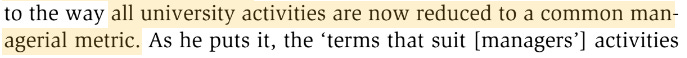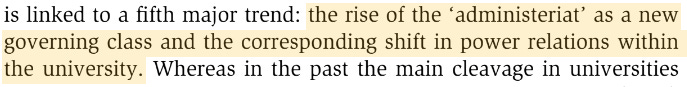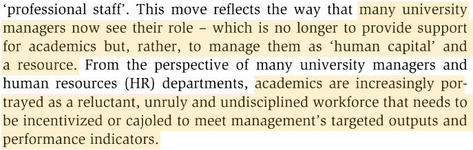 In line with the Jarratt Report’s ideal of reducing all university resources to ‘cash’, this ‘governing class’ of administrative staff see as their prerogative the management of faculty staff as ‘human capital’. Much of their role is to reduce every qualitative element of the university into terms suited to their management. See both Graeber and Shore and Wright:
