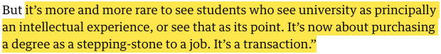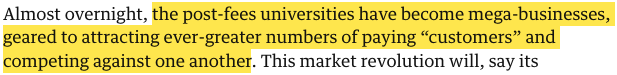 Universities have been, via REF and TEF evaluations within an increasingly large sector, forced to compete for decidedly scant public funding, and are, with student numbers allowed to grow, now forced to compete for tuition income. The universities themselves, efficiently managed corporate entities, tout their wares by embedding their degrees in the labour market, pivoting from the ‘63 Robbins Report’s idealism of ‘essential truth’ and ‘citizenship’ to the cynical pecuniary return it decried (pay to learn; ‘learn to earn’; weigh the cost of a £9250/yr loan accruing interest over 30 years against a purported £100,000 lifetime salary bump). Market forces permeate the sector, and ‘knowledge-production’ is incorporated into enterprise which remoulds education in its image. The 40-year picture becomes clear.