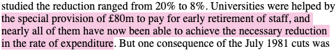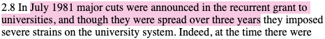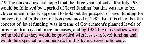 The report makes clear that by 1984, at the outset of Thatcher’s second term, universities were being told that UGC funding will continue to fall in real terms – i.e. ‘less than level’ with the rate of inflation – and that universities ‘would be expected to compensate for [these cuts] by increased efficiency’: