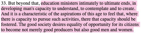 The ultimate end of higher education, the report contends, is to develop ‘man’s capacity to understand, to contemplate and to create’; to enable its ‘citizens to become not merely good producers but also good men and women’.