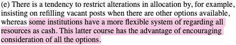 This is a monumental distinction. The report here advises that rather than ‘refilling vacant posts’ – that is, respecting the existence of faculty positions and finding new scholars to fulfil their established function – all university ‘resources’ (staff, materials, funding) can and should be reduced to ‘cash’. All elements of a university are therefore reduced to numbers on a balance sheet to be organised ‘efficiently’, so as to to be ‘optimally deployed’ to generate maximal ‘value’.