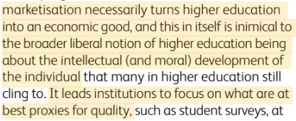Roger Brown, former chancellor of Southampton Solent University and Chief Executive of the Higher Education Quality Council, identified by 2014 that market forces ‘turn education into an economic good’ by shifting university priorities towards ‘what are at best proxies for quality’.43 It’s worth unpacking the implications of this.