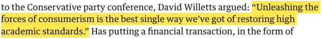 Why do students continue to make the purchase even when the terms on which the commodity – the degree, the standardised and transferrable ‘knowledge’ unit – is bought have proven demonstrably untrue? The answer lies in a paradox contained in Minister for Universities David Willetts’s 2013 address to Conservative party conference:
