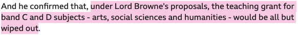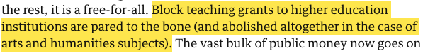 While all subjects have seen universal public spending cuts since the ‘80s, the post-Browne Review 2010 coalition government took a particular axe to the Arts and Humanities (A&Hs) and Social Sciences. Recurrent block teaching grants were, for the A&Hs, abolished by 2014:54
