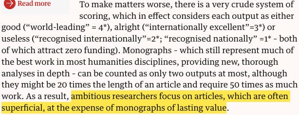 And beyond this logistical difficulty, the nature of the department’s research ‘output’ itself is affected, as faculty are incentivised to produce work that is preeminently assessable: