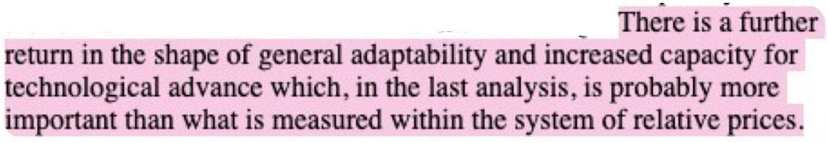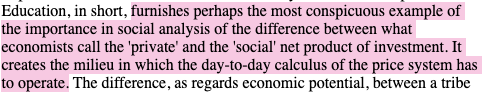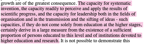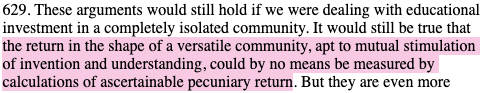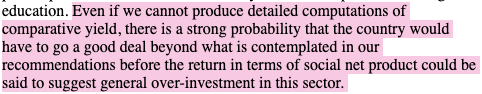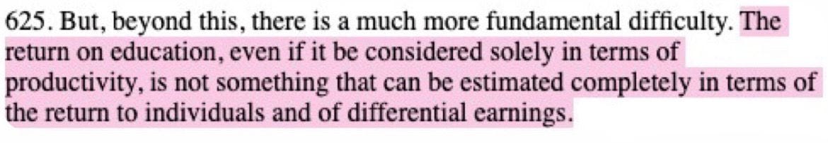 ‘Education … creates the milieu in which the day-to-day calculus of the price system has to operate.’ In other words: the lifetime-salary ROI of different educations is subject to capital, and what ‘the market’ (the collection of individual producers/consumers and institutions which comprise the circulation of capital) deems to be socially or economically productive work – a value judgement for which education is necessary. The report goes on: