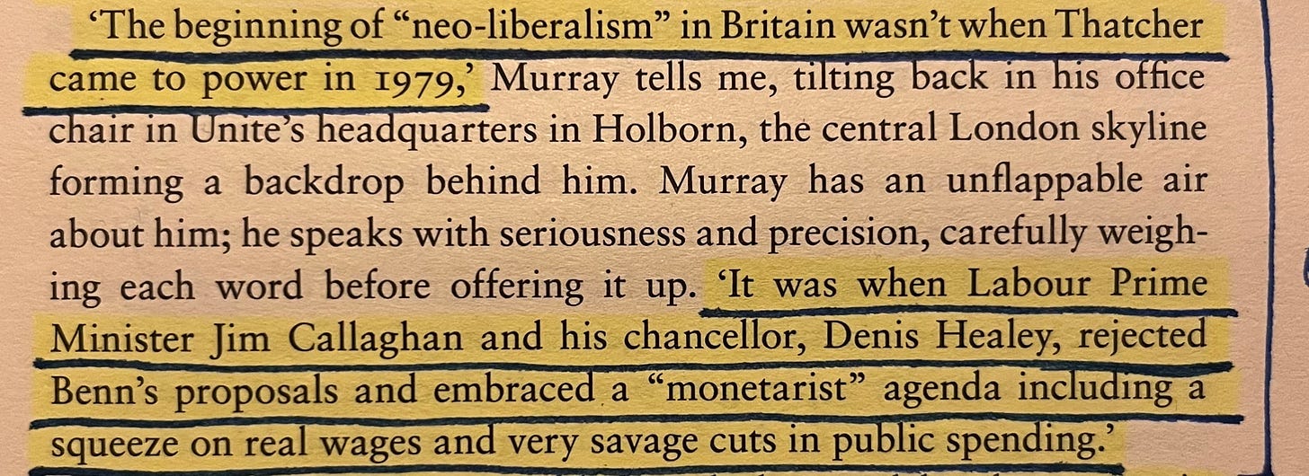 This decisive break with Keynesianism and embrace of austerity – the switch of priority from employment to inflation, from spending to restriction – can be said to have set the stage for the economic order in whose long shadow, fifty years later, we’re still living. Indeed, to hear Andrew Murray, former chief of staff of Unite the Union, tell it:23