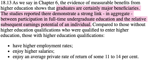 The report ultimately goes on to claim that, of the four ‘stakeholders’ in the university system, students – due to the ‘labour market benefits’ (employability + an 11-14% lifetime salary increase) – are the system’s greatest beneficiaries: