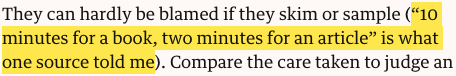 This minuscule research budget allocation is likely due to the categorical unsuitability of the humanities to the particular criteria of the REF.56 Cambridge medieval-philosophy fellow John Marenbon wrote in late 2018 that research assessors reviewing the four ‘units of assessment’ from each full-time faculty member are tasked, in A&Hs departments, with reading ‘the equivalent of a full-length book every day for nine months’. To get through this sheer load, a general rule of thumb – for ascertaining a grade of ‘excellence’ and ‘impact’ – is ‘10 minutes for a book, two minutes for an article’:57