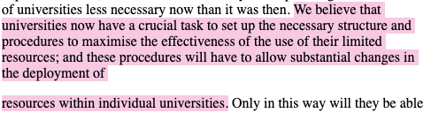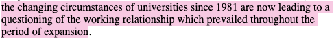 Into this vastly different climate comes the next significant higher education report: the Jarratt Report. Commissioned by the Committee of Vice-Chancellors and Principles, this report immediately positions itself in reaction to swathes of funding cuts imposed on the sector since 1981:28