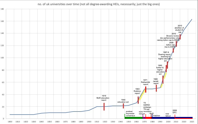 By this point, there were only 22 university institutions in the UK: the 7 that reigned from the 13th-19th centuries (just Oxbridge in England), the 19th-century additions (University of London colleges etc.), and the early 20th-century ‘red-brick’ or ‘civic’ universities which were previously technical colleges – medical/engineering – but were granted independent degree-awarding powers, saving the students having to travel to UoL for external examination.4