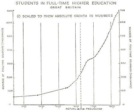 These themes were taken up in 1963 with the publication of the ‘Robbins Report’, a commissioned report from the Committee of Higher Education chaired by LSE economist Lionel Robbins. It is hard to overstate the influence of this 1963 report; all later higher-education reports/acts harken back to it, and seek by the comparison (largely disingenuously) to legitimise themselves. The Robbins Report frames itself as a response to the exponentially growing demand for university places: a projected 250% increase in student place-provision from 1962/3-1980/1 will ‘mark the dawn of a new era in British higher education’.6