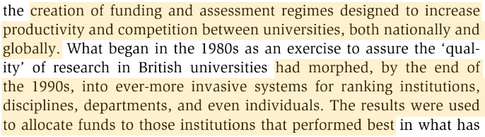The solution, drawn up the following year in 1986, would be the ‘Research Assessment Exercise’ (a precursor to the current ‘Research Excellence Framework’ (REF)), a five-yearly ‘research quality’ evaluation of – and within – each institution, marking research ‘output’ based on a set of standardised criteria. Universities and their departments were, for the first time, made to, in effect, compete for their public funding. Concurrently, the report states the following: