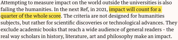 Faculty are incentivised to avoid risk (research/written works that are not published within the five-year assessment period are ineligible for assessment), and to produce faster, digestible, ‘superficial’ articles. Moreover, the research undertaken must be conceivably relevant to the world ‘beyond academia’ – i.e. what research is considered ‘useful’, ‘effective’, or ‘beneficial’ is dictated to the academy by the external culture/economy, limiting academic freedom to pursue publicly counter-intuitive lines of inquiry – as ‘impact’ counts for 25% of the ‘excellency’ score: