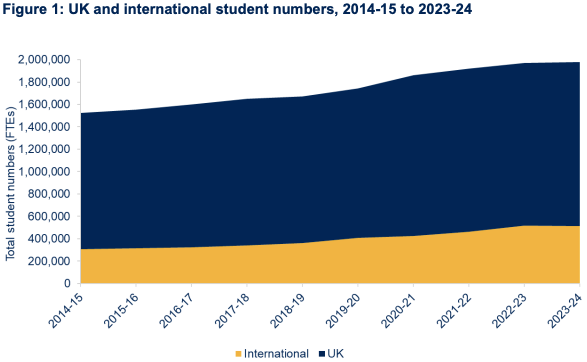 As per Office for Students (OfS)’s latest ‘Financial Sustainability of Higher Education’ report, full-time student levels – both domestic and international intakes – have steadily risen since the 2015 abolition of student number controls.39 (Note that the ‘63 Robbins Report started calling for expansion of the sector once this figure hit 200,000; by 2025 it’s approaching 2,000,000. The total number of UK universities has over this time risen from 22 to almost 170.)