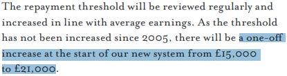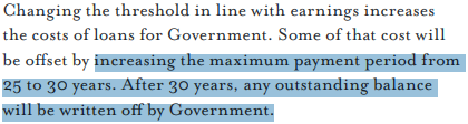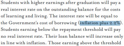 Under this proposed system, uncapped tuition loans would be repaid above an increased graduate earnings threshold of £21k/yr, accruing interest above that threshold at a rate of 2.2% + inflation, and would be written off after a period of 30 years: