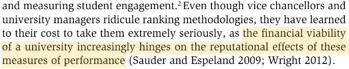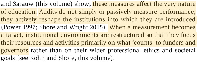 The TEF (2017-) makes similar attempts to quantify ‘excellence’ of teaching with reference to metrics such as dropout rates, student satisfaction survey results, and graduate employment rates. The REF/TEF assessment regimes give rise to what Shore and Wright dub ‘audit culture’, and, it is emphasised, these audits by no means measure performance ‘passively’: