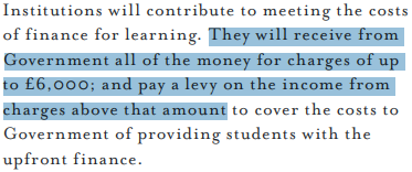 And then recommends that the £3225/yr cap on tuition fees be lifted, and replaced with a system whereby higher education institutions are levied on all income from tuition charged above £6000/yr:
