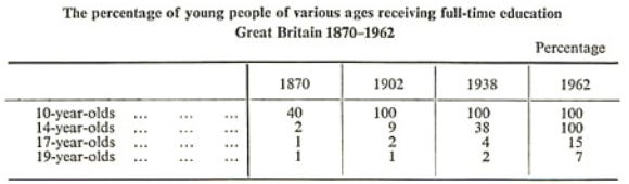 The twentieth century had seen a steady rise in demand for and provision of secondary education: Educations Acts of 19182 and 19443 raised the mandatory school leaving age from 12 to 14 and 15 respectively, and abolished fees first for state elementaries and then for all secondary schooling.