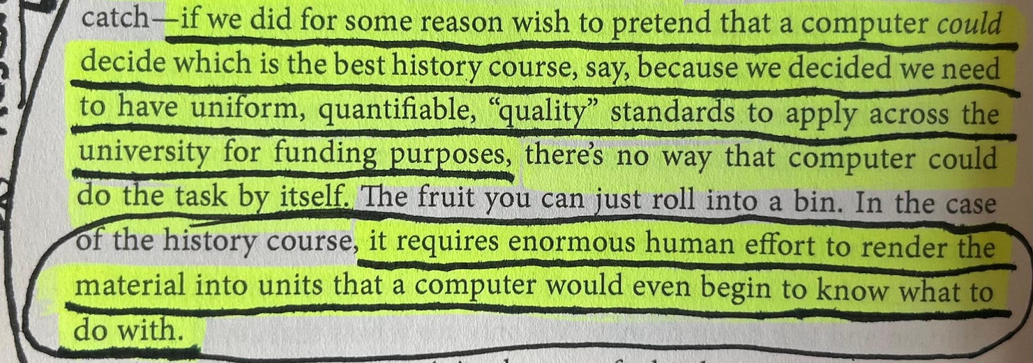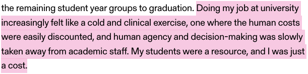 These, as Brown put it, ‘proxies for quality’ end up alienating the entire institution from the reality of its educative service; the terms by which the university comes to understand itself are alienated from scholarship. As Dave Hitchcock, history professor at Canterbury Christ Church University, wrote in a piece from March 2025: ‘My students were a resource, and I was just a cost.’46