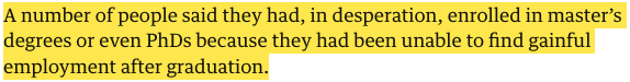 Only 61% of 2022 graduates found full-time work within 15 months of graduation, at which point 26.4% found only non-graduate-level work and 5.5% remained unemployed. Within these 15 months and beyond, 50% of Otte’s respondent graduates had taken non-graduate hospitality, retail, administration, call-centre, supply-teaching or minimum-wage part-time positions. The entry-level job market has become saturated, with recruiters’ 2023 data showing an average of 86 applicants per vacancy. In this climate, respondents reported embarking upon postgraduate degrees ‘in desperation’, bereft of alternative options: