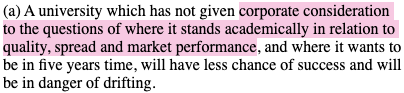 To this end, universities will have to engage in ‘strategic planning’ processes ordinarily native to ‘other organisations’ – namely, ‘corporate strategic plans’. The report goes on to criticise existing sector-wide procedures and recommend corporate ameliorations. To start, the report criticises the lack of a ‘merit-based’ system of resource allocation within and across universities: