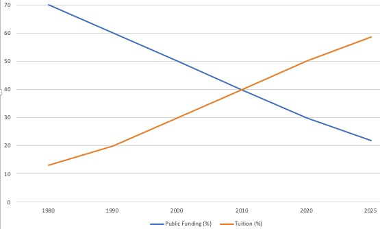 OfS figures show that from just 2020/21-2025/26, the proportion of public funding a university receives has, on averaged, decreased from 25.5% (11% from recurrent grants, 14.5% from research grants) to just 21.8% (8%, 13.8% respectively). Over the same years, funding from tuition fees – now borne by the students – has increased from 56% to 58.5%.41 If the trends since 1985 aren’t clear enough, public funding and private tuition loans are negatively correlated: