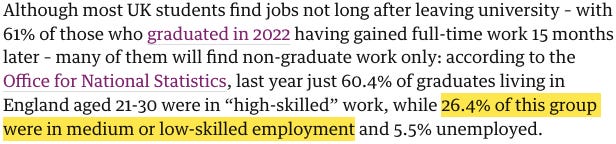 Julian Coman for the Guardian noted, again by 2014, that the pecuniary ROI of a university degree had already diffused across the popular consciousness.47 But by 2024, Jedidajah Otte demonstrated the complete dissolution of this ‘labour market benefit’ – ‘purchasing a degree as a stepping-stone to a job’ – ideal.48