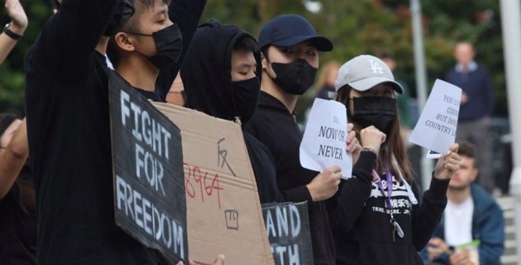 The first action of this kind I can remember seeing, organically and unexpectedly, was during a brief stint down at the University of Exeter, whereat hundreds of students gathered in indignation to mourn the shooting of a Hong Kongese 18-year-old pro-democracy protester at a CCP military parade:64