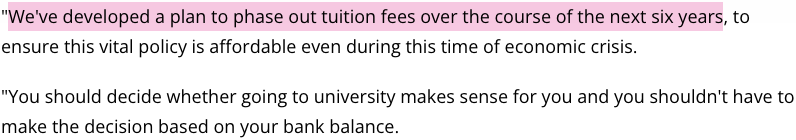 In December 2010 a Parliamentary vote on, contrary to Browne at al.’s recommendations, simply raising the existing tuition fee cap to £9000/yr passed with 323 votes in favour to 302 against.35 Nick Clegg, in violation of his pledge, voted for the motion, later apologising and decimating LibDem support for a decade.36 The Browne Review’s other points – on interest and the 30-year write-off period – were implemented, and the fee cap rose to £9250/yr by 2017 with inflation.37