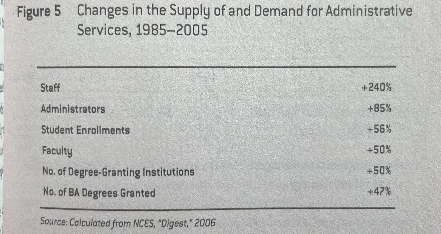 So what does this transmogrification into the audit-successful institution look like? What does the competitive university – for whom excellent research is that which the REF deems to be excellent, and for whom excellent teaching is low dropout rates, high student-satisfaction results, and high graduate employment rates – become? Graeber notes that the corporatisation of universities in the ‘80s (ostensibly in an improvement of ‘efficiency’) resulted in the growth of administrative and managerial staff outpacing the growth of faculty staff by almost five times: